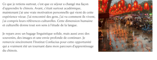 L’Institut leur a proposé des cours de lecture et d’expression orale, ainsi qu’un accompagnement ciblé à la préparation du HSK (Test de compétence en chinois).