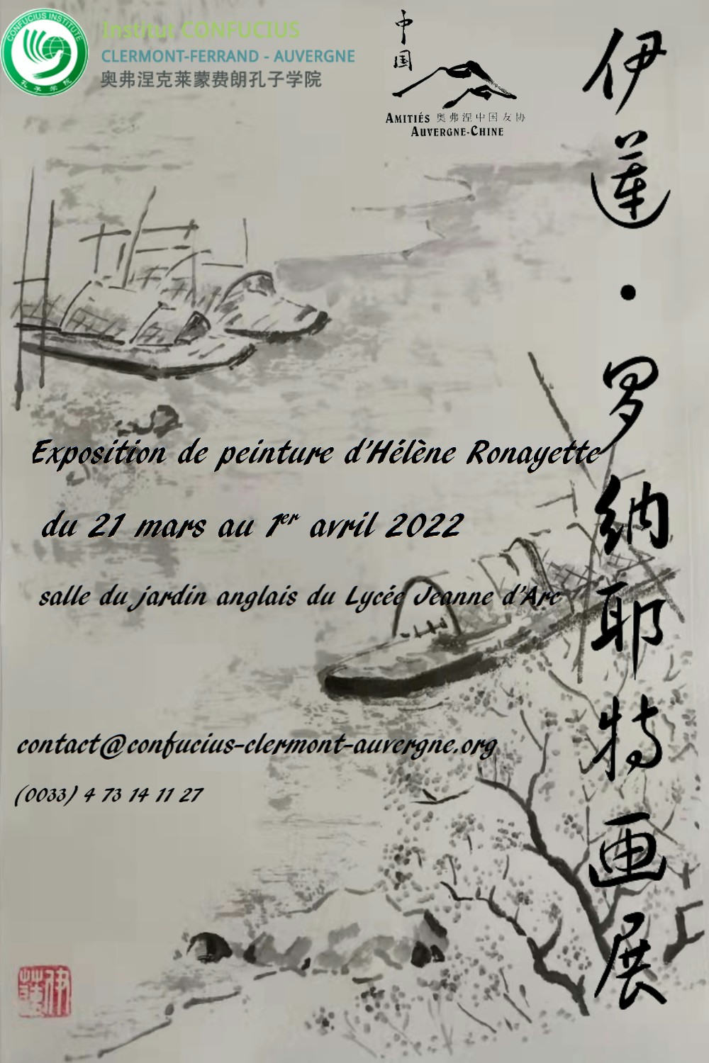 Organisée par l’Institut Confucius avec le concourt de l’Association Amiltiés Auvergne-Chine, l’exposition se déroule du 21 mars au 1er avril 2022, visite sur réservation, accès par l’entrée princiaple du Lycée Jeanne d’Arc, 40 av. de Grande Bretagne 63000 Clermont-Ferrand.
