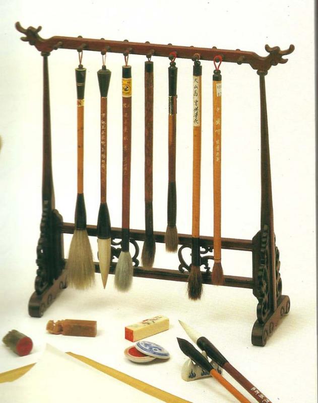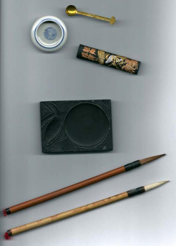 La pratique de la calligraphie a pour outils les « quatre trésors du cabinet du lettré » (文房四宝) : le papier, le pinceau, l’encre et l’encrier. Autrefois, la calligraphie était prise en compte dans les concours du mandarinat. Elle faisait partie de la culture personnelle.