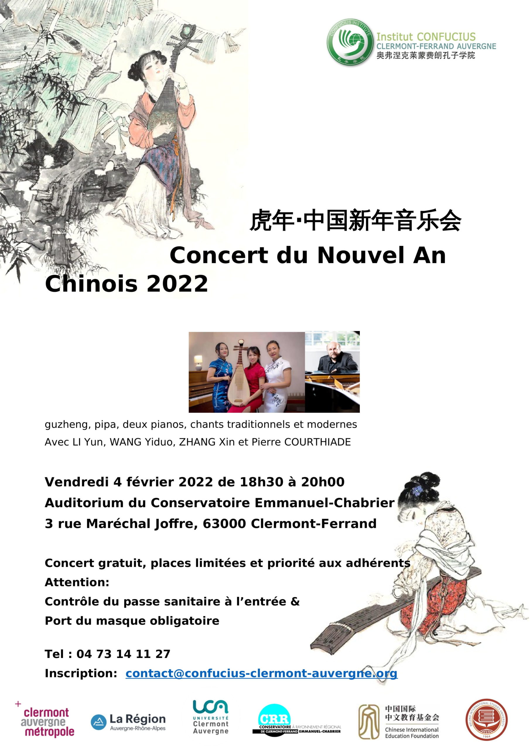 Avec la coopération du Clermont Auvergne Métropole et du Conservatoire Emmanuel-Chabrier, le concert du Nouvel An chinois se déroulera le vendredi 4 février au Conservatoire Emmanuel-Chabrier, entre 18h30 et 20h00. Veuillez réserver vos places sur: